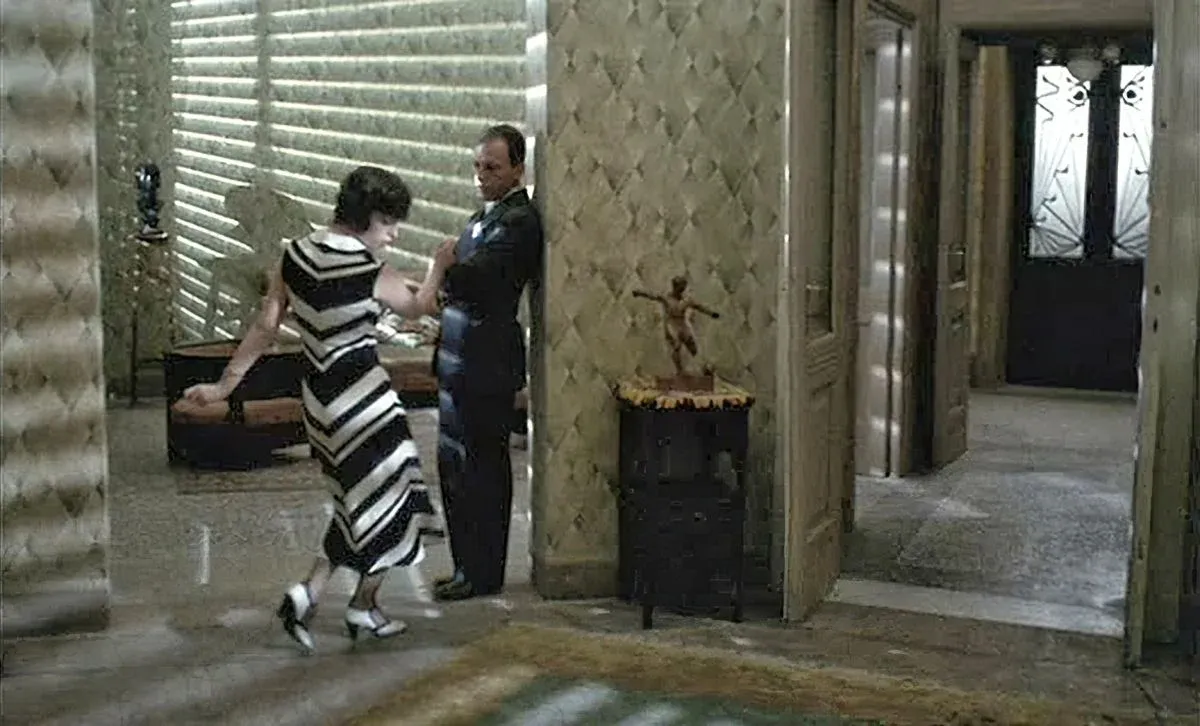 1. Appetite: Giulia Marcello’s fiancée, Giulia, is pure Appetite. She is consistently framed in relation to the sensory world – she is eating, dancing, or discussing domestic trivialities. In one of the film's most visually striking scenes, she stands in her apartment while Venetian blinds cast bar-like shadows across her dress, which itself features a zig-zag "dazzle" pattern. She blends into the chaotic interplay of light and dark, consumed by her environment. She represents the "blindness" of the bourgeoise, happy in her ignorance, described by Marcello as "mediocre... a mound of petty ideas".